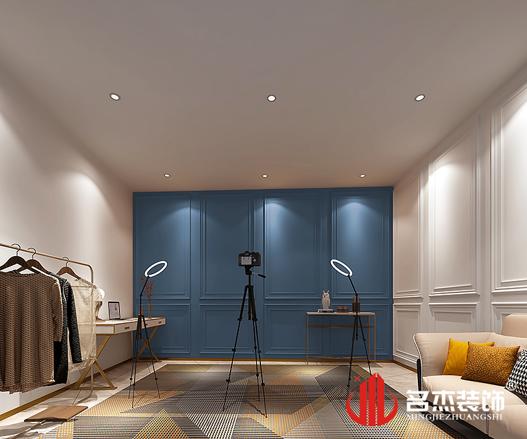 在直播間和展廳區(qū)域使用不同的造型增加整體的設(shè)計(jì)感,天花造型也不會(huì)過(guò)于浮夸,部分墻體使用時(shí)下流行的霧霾藍(lán)來(lái)作為點(diǎn)綴色,使得整體的時(shí)尚感更加特出。