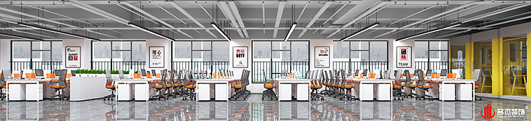 整體的辦公裝修設計空間采用的是時尚簡約風格,大量的使用logo色讓空間不再單調的同時,還能增加整體空間的設計層次感。采用弧形玻璃隔斷為的就是增加設計的設計感,也讓空間綻放出不一樣的設計感。