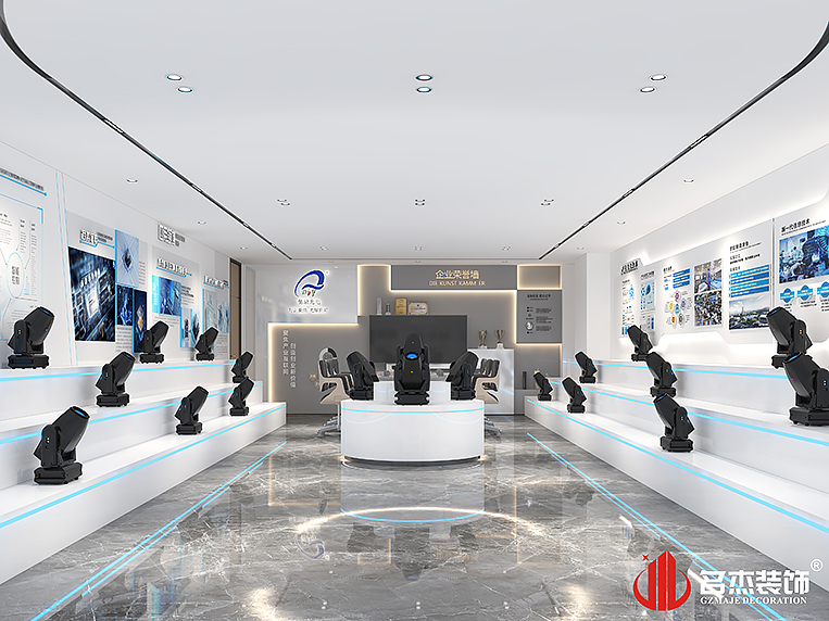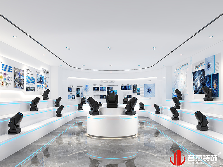 在前臺(tái)區(qū)域和接待區(qū)域使用熟悉的弧形元素來(lái)打造一個(gè)流暢的動(dòng)線,流暢的流動(dòng)線條象征著企業(yè)如魚得水般的發(fā)展。為了強(qiáng)調(diào)舞臺(tái)燈光行業(yè),設(shè)計(jì)團(tuán)隊(duì)特意在過(guò)道的位置使用該企業(yè)的燈光產(chǎn)品來(lái)增加整體辦公裝修設(shè)計(jì)空間的設(shè)計(jì)層次感。展廳區(qū)域則是恰到好處地使用燈光來(lái)輔助,讓其打造出一個(gè)視覺(jué)感非常贊的展廳區(qū)域。