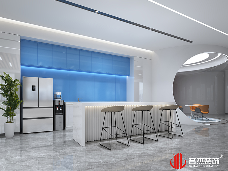 整體使用時尚簡約的風(fēng)格,讓辦公空間看起來更加簡潔,同時在不同區(qū)域使用藍色作為點綴色,給空間增添了幾分科技感的同時,也讓空間變得不那么單調(diào)。前臺區(qū)域使用圓弧造型的吊頂,搭配弧線形的背景墻,形成一種呼應(yīng)的同時,還能夠增加前臺空間的層次感。在辦公區(qū)域使用藍色噴漆,區(qū)別于傳統(tǒng)的黑白灰,讓空間更加具有辨識度。