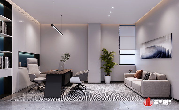 整個辦公裝修設計空間是以時尚簡約的風格來作為主打風格的,加入企業LOGO色——藍色,作為貫穿整個辦公裝修設計空間的點綴色。前廳的背景墻使用的是一種漸變的手法,讓辦公裝修設計空間變得更有設計感,同時在前廳的吊頂使用圓弧的元素,讓辦公裝修設計空間變得更加有層次感。