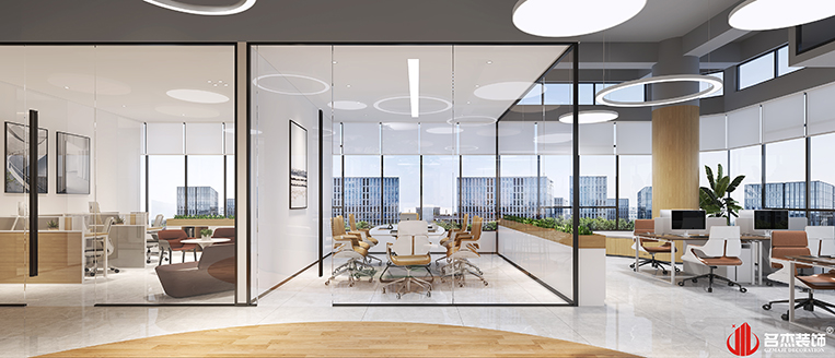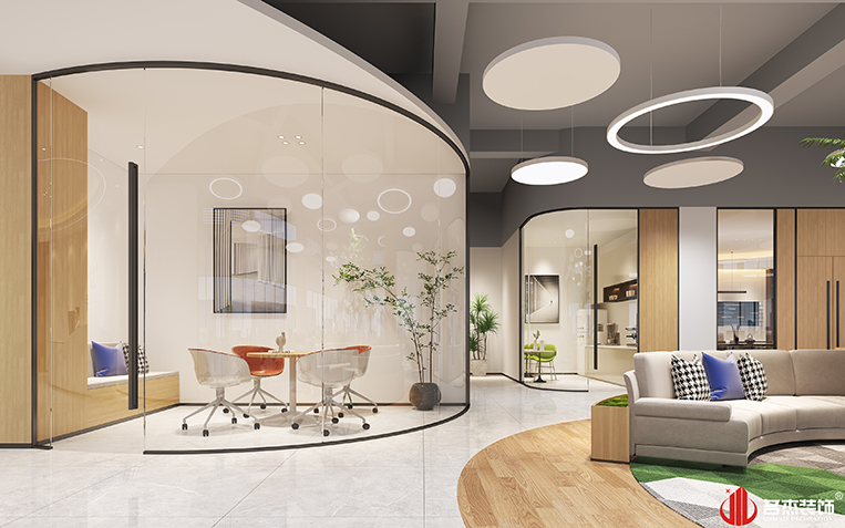 整體風格是按照時尚簡約風格來設計的,但是在這里面加入了原木的一些元素,讓整個空間有著清新自然的氛圍,同時圓弧動線的加入也讓空間的整體觀感得到一個很大的提升。特別是在休閑區這一個區域,能夠很好的將休閑的元素發揮出來,在這個空間中顯得尤為突出。在天花區域,設計團隊采用的是工業風來打造,但在這個空間加入圓形吊燈和圓形的裝飾物,讓天花區域看起來更加有特色。#廣州辦公室裝修設計#