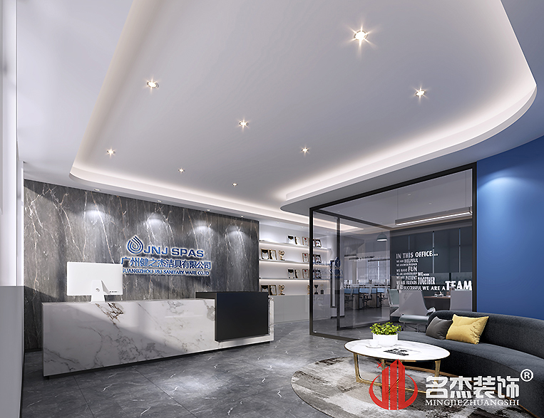 本案例是以潔具為主的企業,設計師通過溝通和了解,通過將企業LOGO的顏色加入到整體的設計當中,把企業文化和品牌意識融入到整個空間當中。同時也加入了玄關的設計元素,讓整個空間顯得格外的溫馨