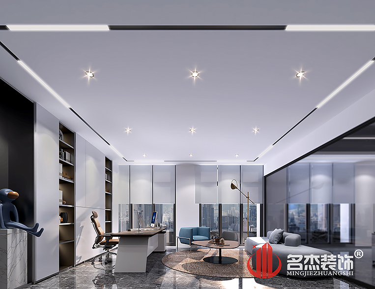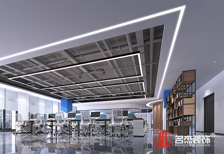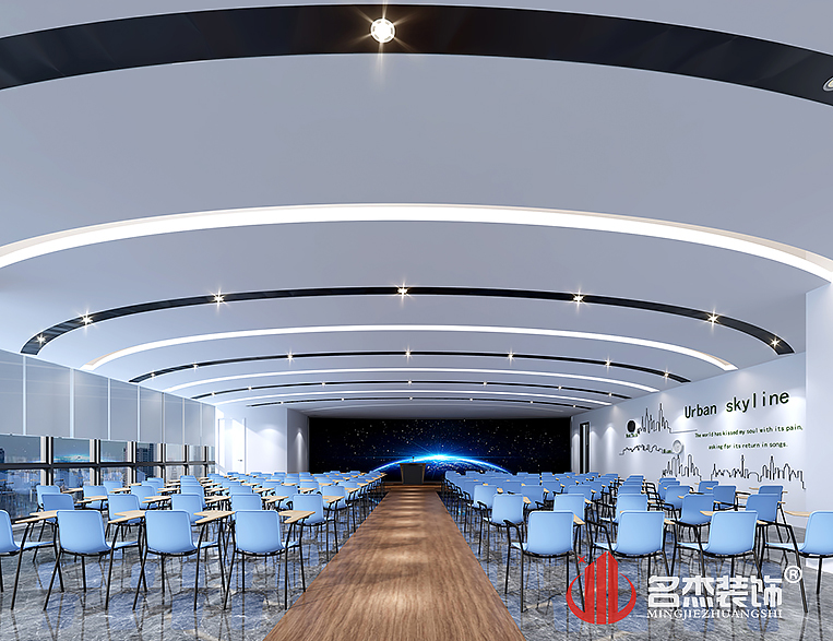 考慮到企業(yè)是為客戶提供專業(yè)的咨詢服務(wù),整體設(shè)計運用了藍(lán)色燈帶來襯托出滿滿的科技感,以及圓弧形元素能夠讓整個辦公室裝修設(shè)計空間表現(xiàn)力更強。運用圓形穹頂使得整個培訓(xùn)室看起來更加的大氣。