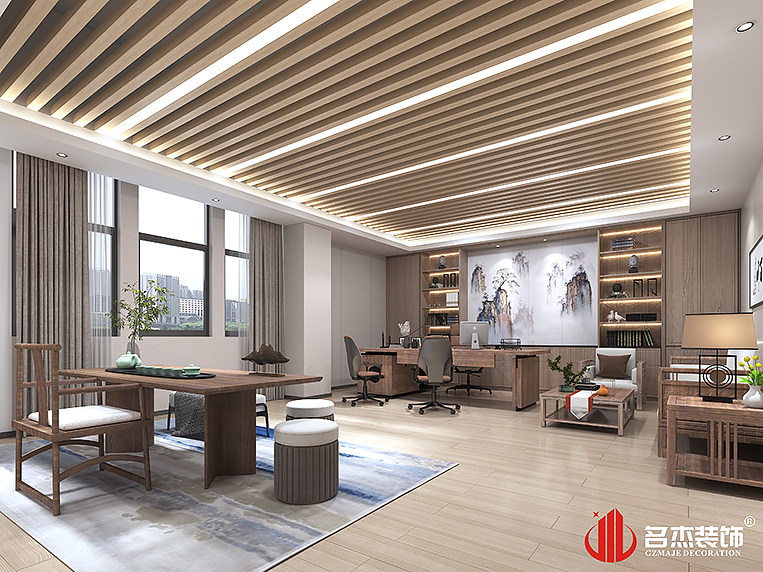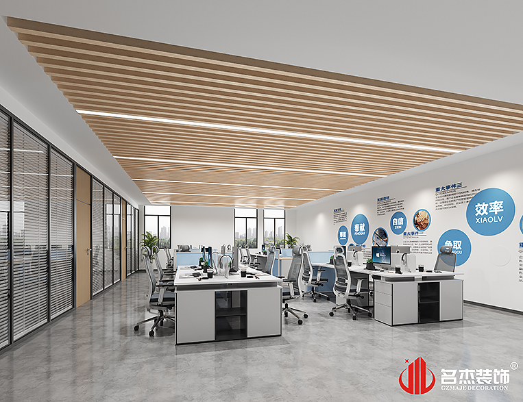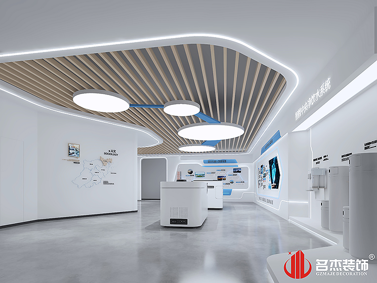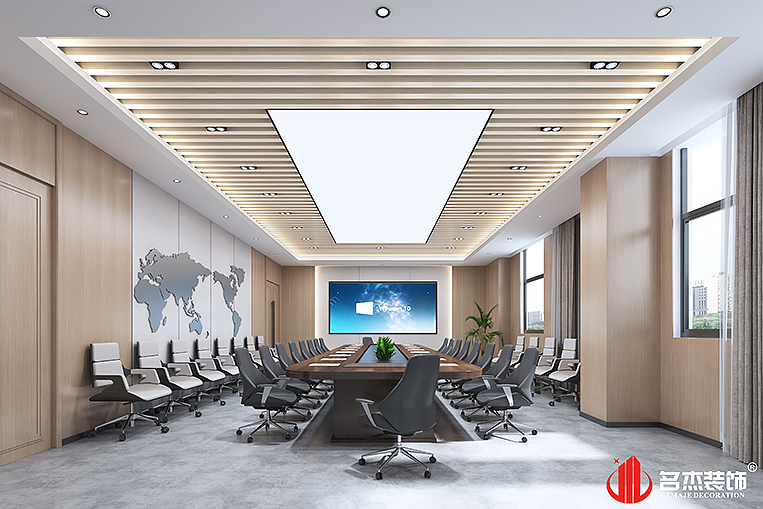 由于該行業是屬于高新科技行業,設計團隊在整個辦公室裝修設計空間加入木色的吊頂,讓空間的格調不再屬于冷色調,同時在部分區域加入科技的元素,響應出該行業的科技屬性。在展廳區域則是特意使用上多邊形的木色吊頂,沿著動線來構造,形成一種呼應。