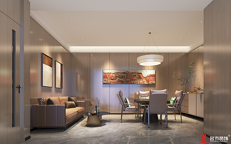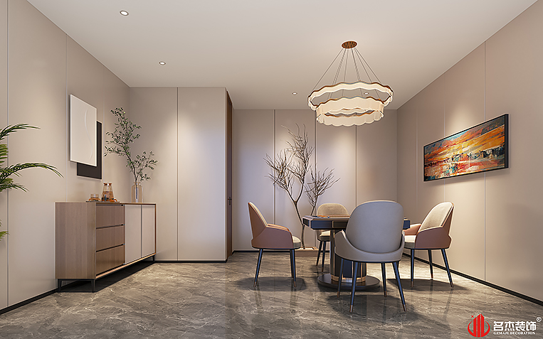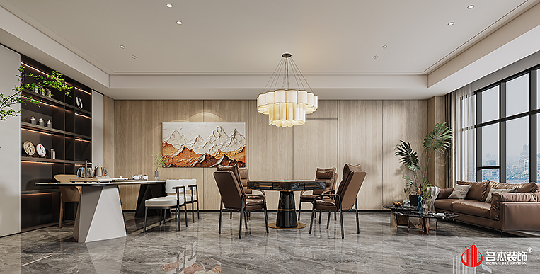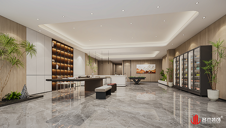 空間中的前臺接待區域使用造景的設計手法,來突出風生水起的設計重點,配合前臺背景墻使用的碳晶板,以及燈條作為點綴設計元素,搭配出不一樣的裝修設計效果。對于棋牌休閑空間來說,燈光是非常重要的元素之一,因此設計團隊也著重在這方面上的設計,通過使用造型不同的燈具,為空間增加了不少的時尚潮流感。#廣州公裝裝修公司#