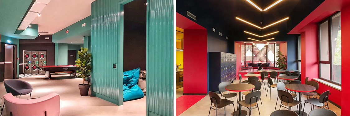 公共區(qū)域的家具采用的是標(biāo)志性的元素和意大利生產(chǎn)的桌椅,這里面也有很多定制的元素,都是可以滿足各個空間的需求和靈活使用的專門開發(fā)的,每一個元素,都能夠感受到色彩、飾面和形式上的仔細(xì)推敲和精美呈現(xiàn)。對于細(xì)節(jié)和色彩的縝密研究不僅僅是在家具上面,還體現(xiàn)在整體配色和建筑的飾面上,使用跳躍的顏色和柔和的顏色進(jìn)行對比、硬質(zhì)和軟質(zhì)材質(zhì)之間的對比、自然肌理和鏡面材質(zhì)之間的對比。CX Turin Regina的目的是為每個客人創(chuàng)造出一個熟悉且有安全感的空間范圍。每個學(xué)生都擁有一間視野開闊的單人房,以及可供長期住宿的所有舒適設(shè)施。