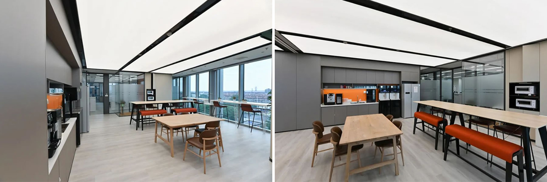 設(shè)計團隊特意選擇了一處大型開敞的臨窗場地,在酷炫的3D裸眼展示室旁邊也打造了衣蛾4S店的培訓(xùn)和茶水間二合一空間,來滿足客戶快速發(fā)展的團隊培訓(xùn)和新品發(fā)布,員工活動的需求。臨近建筑幕墻的位置,設(shè)計團隊就設(shè)計了一派沿窗的休閑階梯造型臺階。員工部分選用了可升降的辦公桌,來滿足員工辦公的個性化需求,白灰色的家具搭配,混搭淺木色的休閑洽談區(qū)域,地面則是選用環(huán)保地毯來提升空間品質(zhì)和美感。